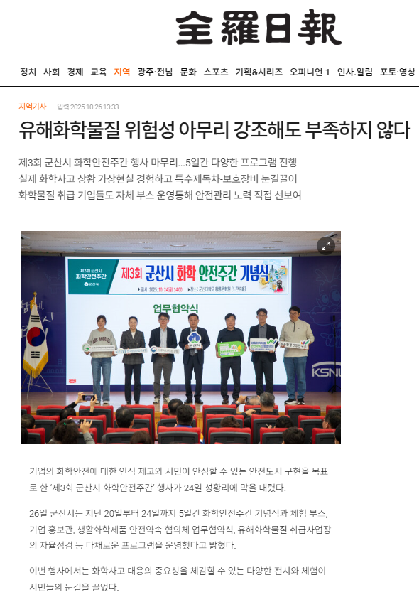 한편 이번 행사는 군산시를 비롯해 화학물질안전원, 전북지방환경청, 전북119특수대응단, 생활화학제품 안전약속 이행협의체, 지역 기업 및 단체 등 20여 개 기관이 함께 참여하며, 산업과 시민이 함께 만드는 ‘안전한 화학도시 군산’의 가능성을 확인했다.